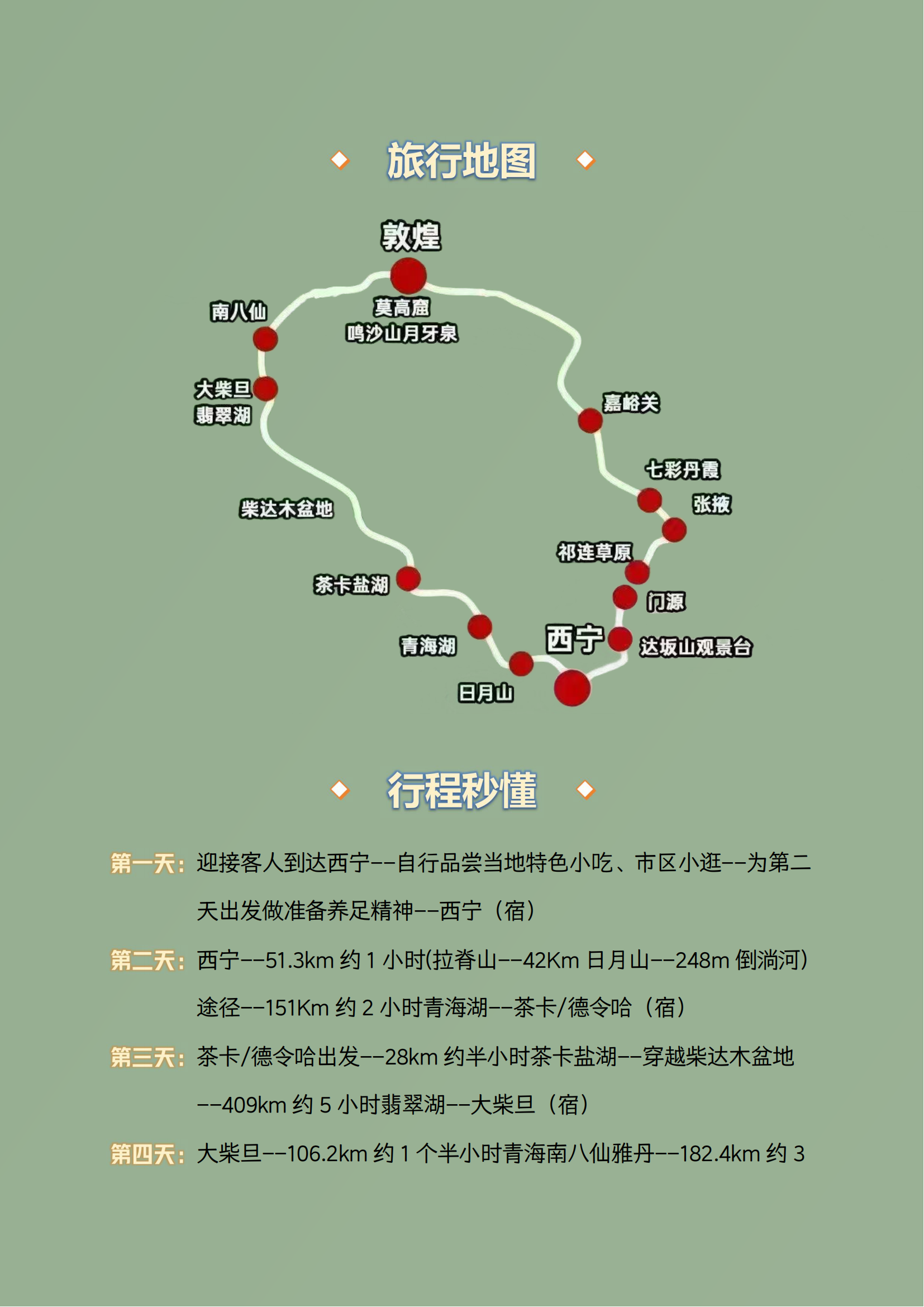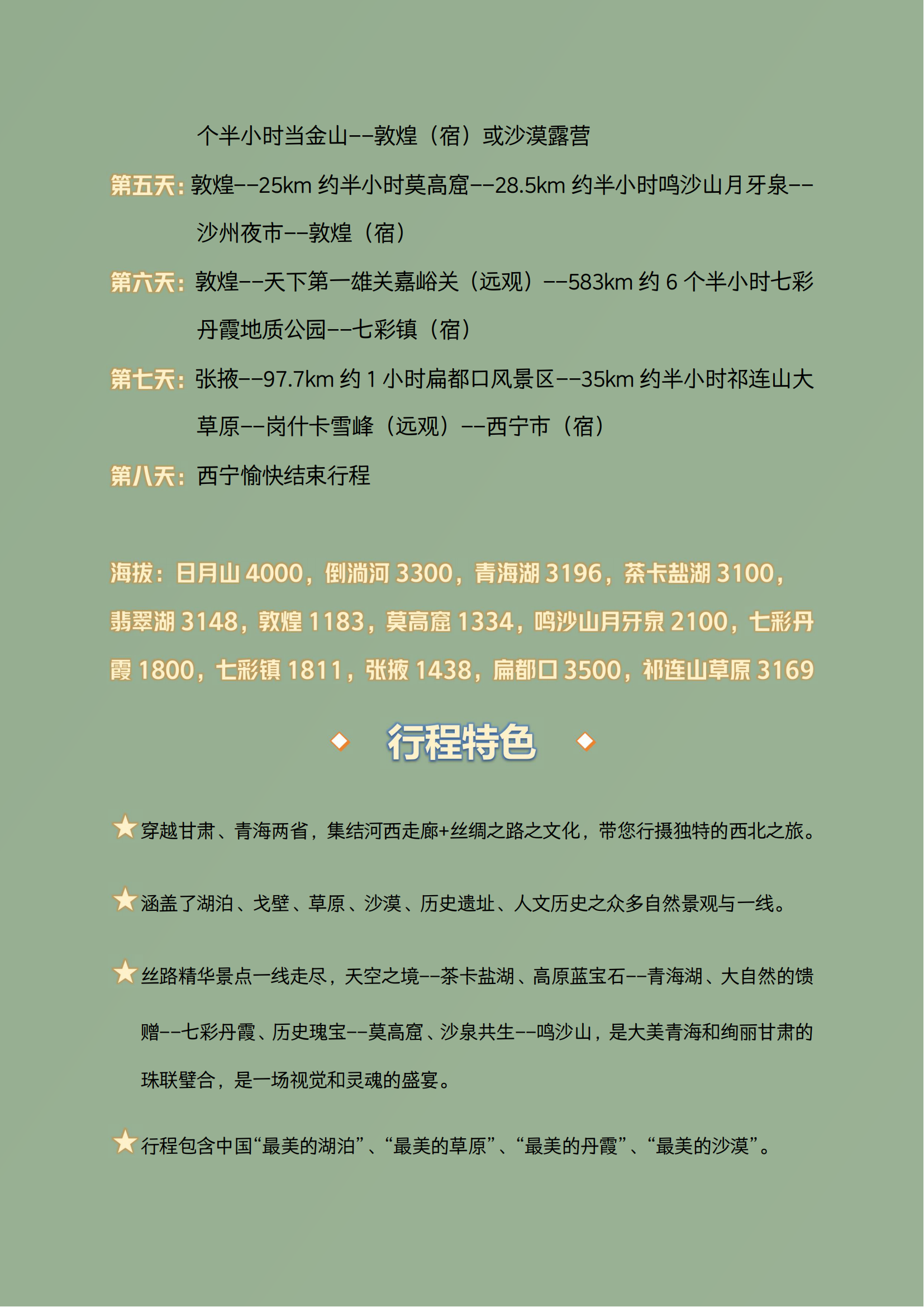3.门票:含青海湖黑马河、茶卡盐湖、翡翠湖、莫高窟(报价包含B票100/人,若当天没有B票需游客补差价升级A票)、鸣沙