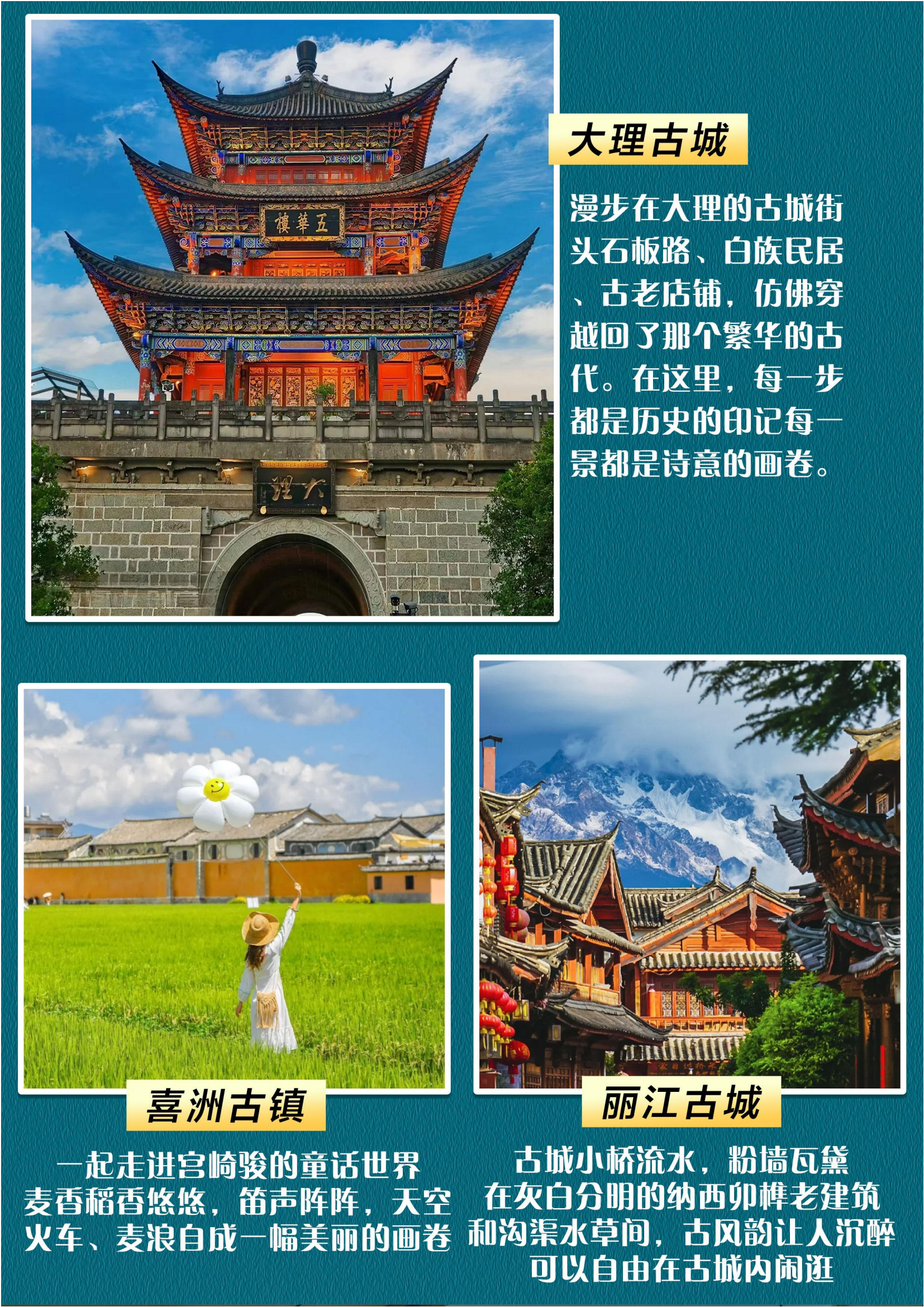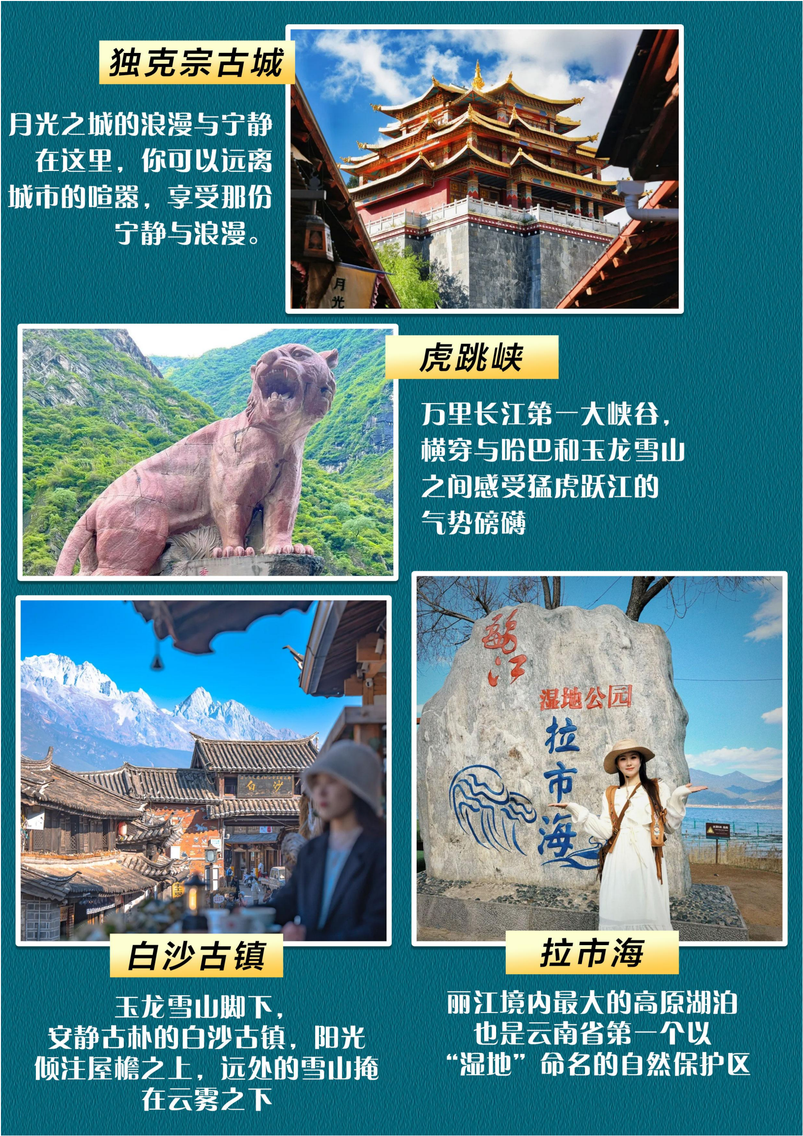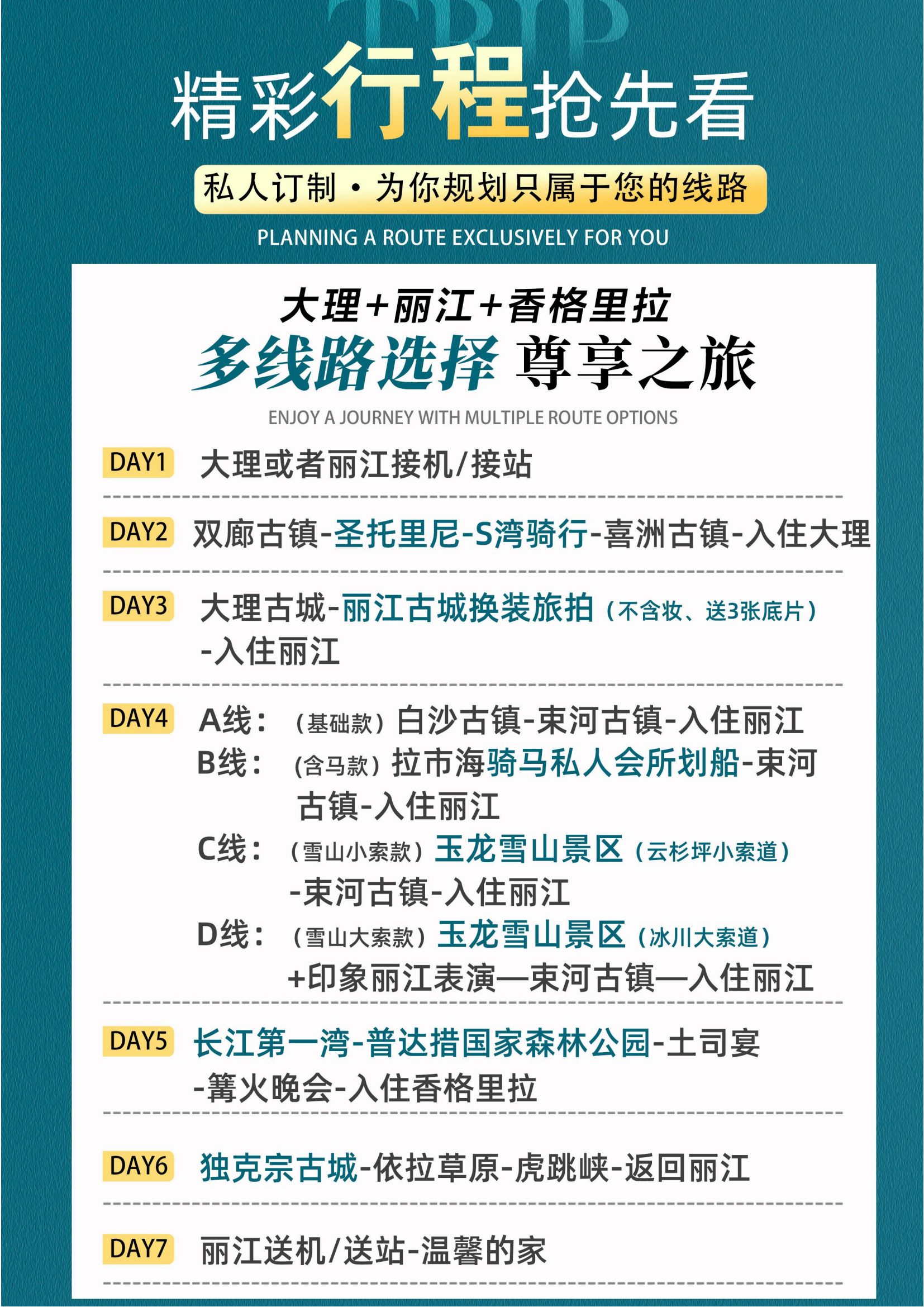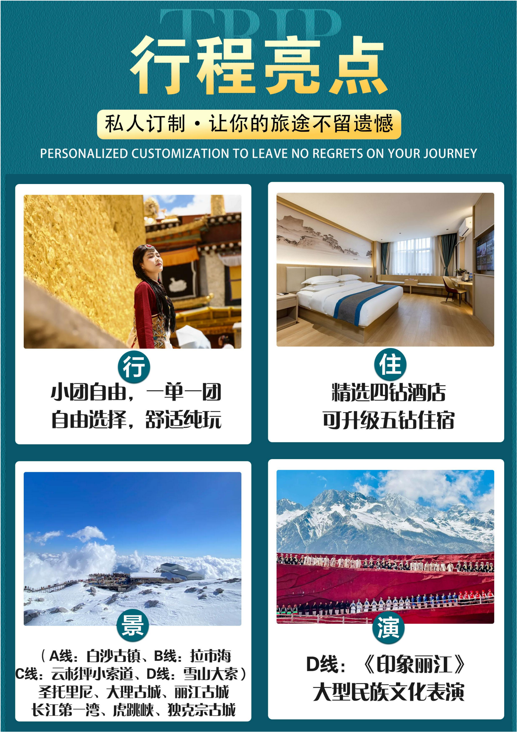 A 线(白沙古镇)或 B 线(拉市海骑马私人会所划船) 或 C 线(玉龙雪山云杉坪索道)或 D 线(玉龙雪山冰川大索道+印象丽江)(四条线路无法同时游览,最晚出团前一天确认)