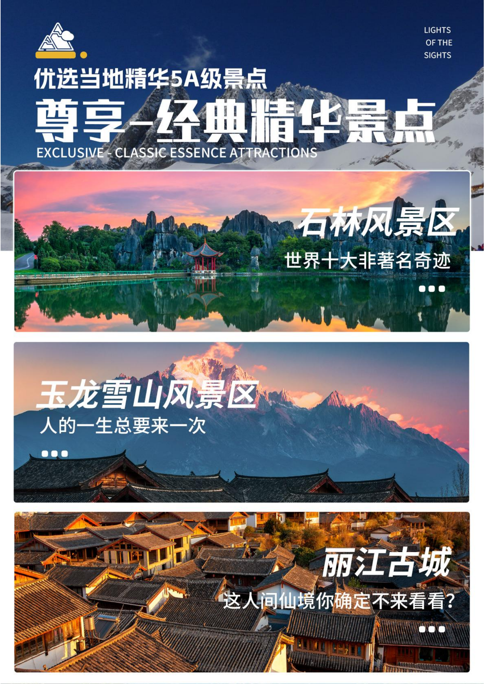后乘车游览纳西族的神山【玉龙雪山】,整个玉龙雪山集亚热带、温带及寒带的各种自然景观于一身,构成独特的“阳春白雪”主体景观。