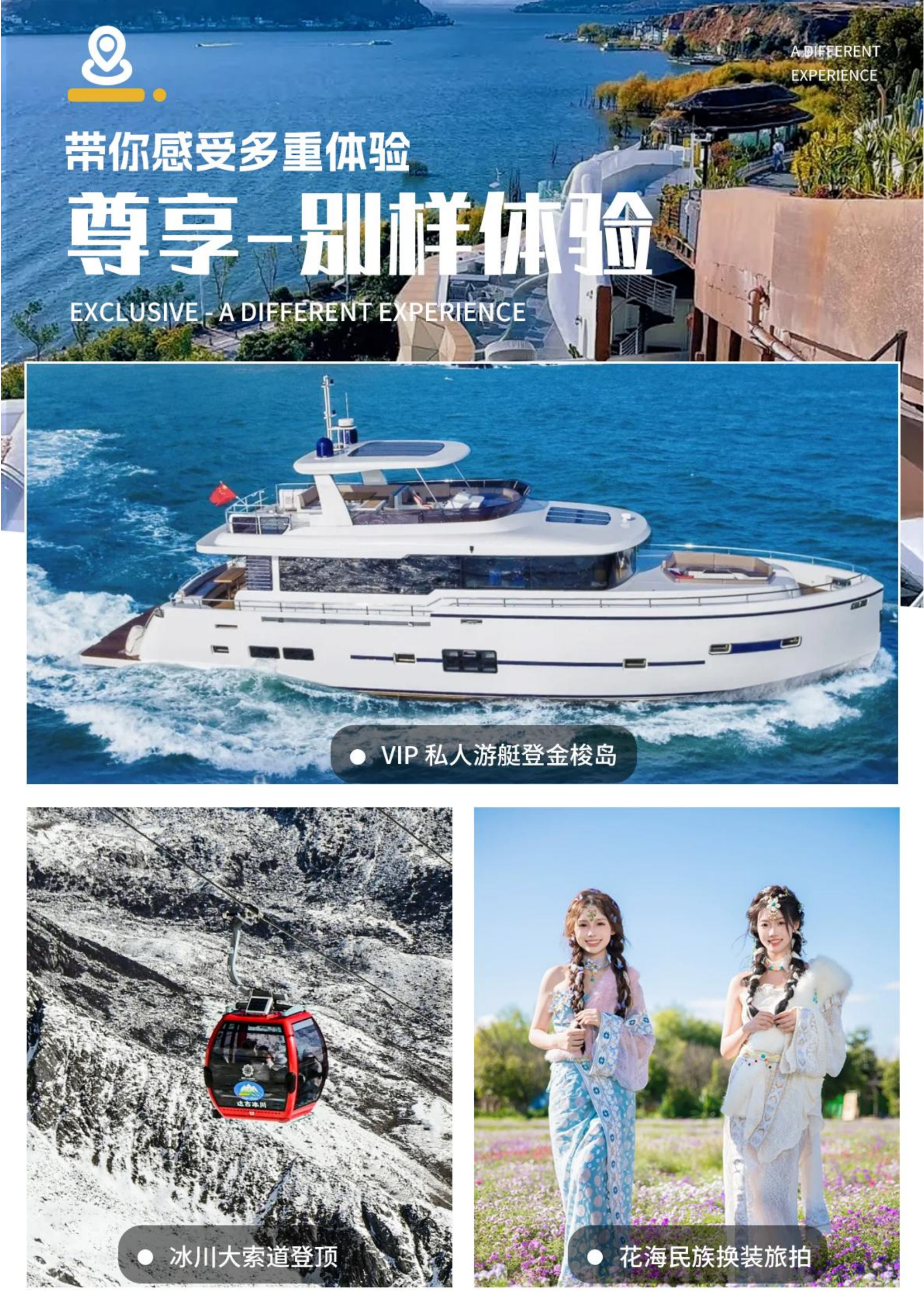 另由于不可抗因素或淡旺季索道配额有限等情况无法正常游览冰川公园大索道,我们会根据当天实际情况做备选方案调整改走小索道云杉坪或中索道牦牛坪,并根据实际情况退大索道差价)从海拔 3000 米的草甸出发,穿越高大挺拔的各种松林杉树,到达海拔 4506 米高的雪山冰川,欣赏大自然恩赐的美景(游览约 90 分钟,不含排队及乘车时间)。