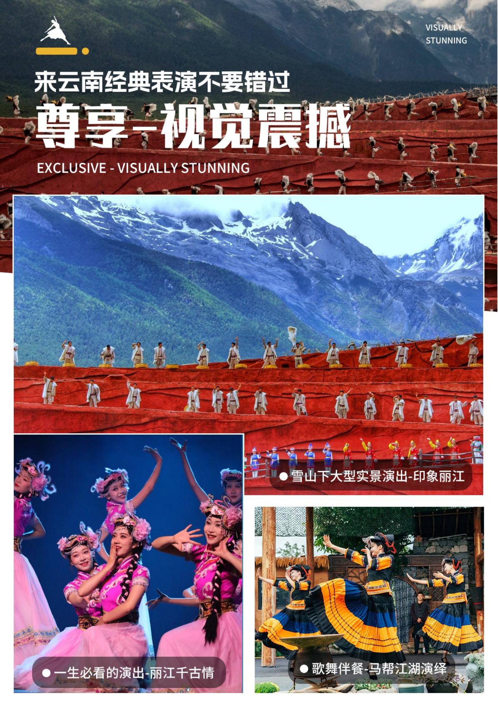 后前往观看大型实景演出《印象丽江》全剧分为“古道马帮”、“对酒雪山”、“天上人间”分,展现了古老的东巴文化,悠久的茶马古道历史和当地的纳西民俗民风。“打跳组歌”“鼓舞祭天”“祈福仪式”共六大部,演出以玉龙雪山的自然风光为天然背景,偶有风云突变,风、雨、雪、云、雾、阳光,这些都是大自然赋予实景演出的有效组成元素。随着节目的进行,大自然的演出也在不断变幻,时而风味云涌,时而云开雾散,时而狂风骤雨,时而大雪纷飞,将带给您不同的体验。