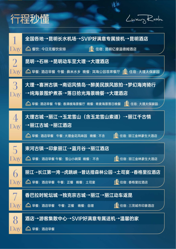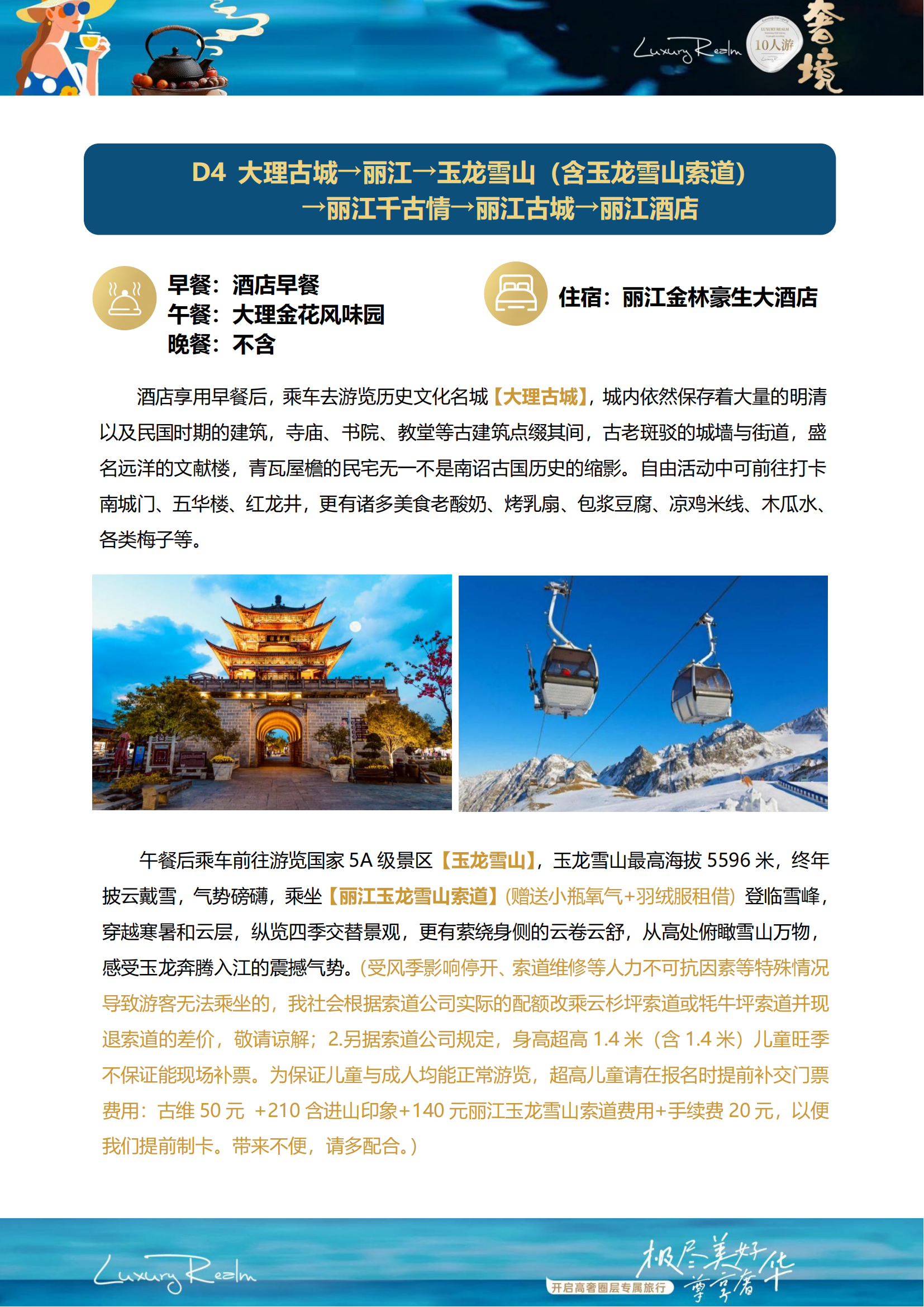 大理古城→丽江→玉龙雪山(含玉龙雪山索道) →丽江千古情→丽江古城→丽江酒店