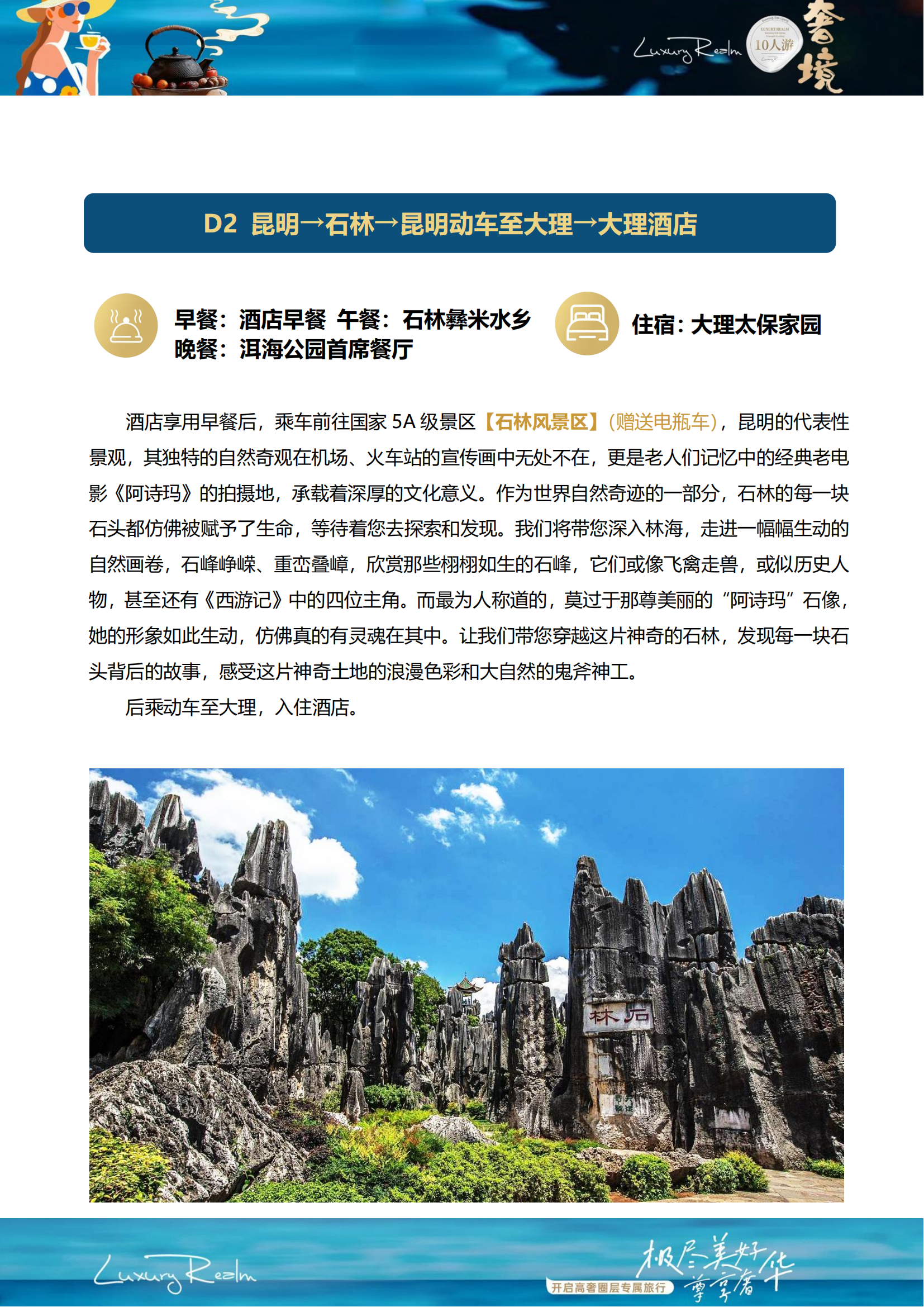 早餐:酒店早餐 午餐:石林彝米水乡 晚餐:洱海公园首席餐厅